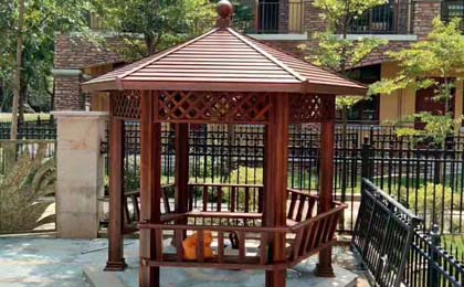 仿木紋鋁型材生產出來的鋁合金涼亭應用性強,適應于室內外各類場合,而不會出現褪色,脫落等現象。其防腐性、耐候型、涂層附著力和材質強度等方面,是其他材料無法比擬的,是建筑裝飾型材產品中應用優勢最強的型材。