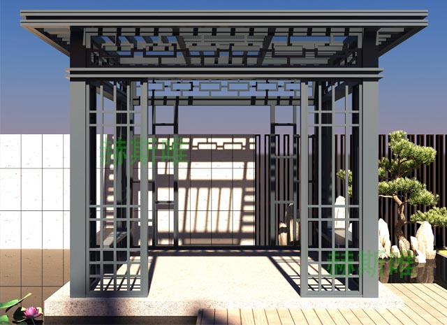4、新中式鋁合涼亭安全牢固。高強度鈦鋁合金材質,可抵抗各種外力沖擊,不斷裂、不坍塌、不傾倒,安全性能高!