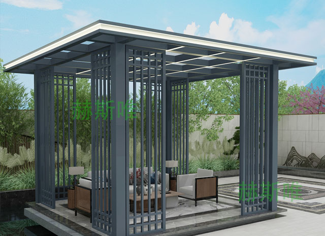 新中式涼亭:新中式涼亭是目前較為受歡迎是一款涼亭樣式,在時間和經驗共同下,符合國家環保的要求,終于打破了普通涼亭的這一缺憾常規,全面利用了鋁合金型材的優勢,完美的打造出了款式多樣的新中式鋁合金涼亭。保留了原來鋁合金涼亭的美感外觀,在外形變化上完美的彌補了其他材質不能做到的多變化,不能隨著環境變換而變化的有以下的特點。
