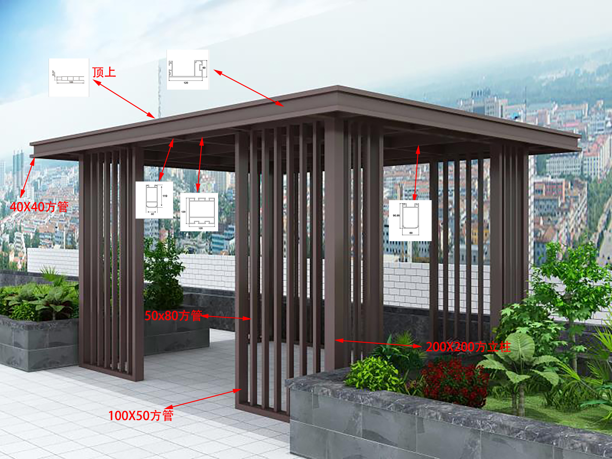 4、新中式鋁合涼亭安全牢固。高強(qiáng)度鈦鋁合金材質(zhì),可抵抗各種外力沖擊,不斷裂、不坍塌、不傾倒,安全性能高!