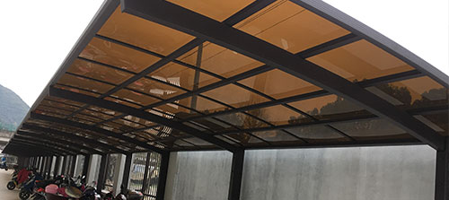 頂棚采用進(jìn)口聚碳酸酯板,抗沖擊比玻璃強(qiáng),有效防止高空墜物